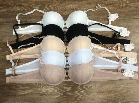 Бюстгальтер женский с формованными чашками, Push-Up эффектом, кружевной. Бретели регулируются по длине, съемные. Стан из микросетки. В центре декоративная шнуровка с пряжками и бантик.