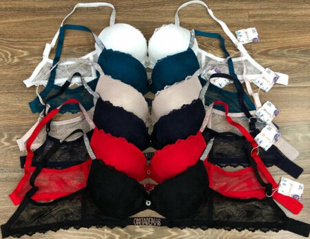 Бюстгалтер - балконет кружевной, формованная чашка с Push-Up. Бретели регулируются, съёмные только сзади, со стразами. В центре декоративные элементы: лента с надписью из страз, бантик из органзы с подвеской. Стан маечного типа, выполнен из тонкого кружева с фесточатым краем по низу. Модель представлена в чашке C.