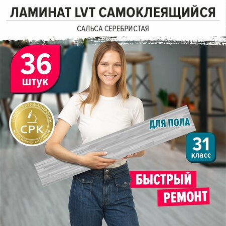 Cамоклеющийся влагостойкий кварц-виниловый ПВХ ламинат под дерево для стен и пола "Сальса серебристая" 914х152мм 36 шт. вместо линолеума и ламината из МДФ
