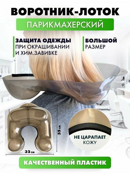 Парикмахерский воротник с лотком позволяет аккуратно произвести окрашивание волос, не испачкав одежду клиента и пространство вокруг. Воротник пластиковый, отличается легкостью, прочностью и износостойкостью. Парикмахерская пелерина приятная на ощупь, не вызывает аллергии и раздражения кожи. Диаметр горловины регулируется, позволяя добиться идеальной посадки. Выполняет роль защиты во время окрашивания, завивки или уходовых процедур, защищая шею и одежду клиента от попадания краски и косметических средств. Силиконовый воротник легко поддерживать в чистоте, достаточно сполоснуть изделие водой, протереть сухой тканью лоток для пеньюара снова готов к работе. Цвет - черный прозрачный.