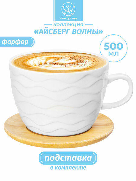 Чашка для капучино и кофе латте из серии «Айсберг волны» от Elan Gallery предназначена для эстетичной сервировки вашего стола. Размер ёмкости – 14,5х11,5х8 см, объём – 500 мл. Выполнена из высококачественного белого фарфора. Он не впитывает цвет напитков и легко отмывается, благодаря чему надолго сохранит свою белизну. Поверхность изделия украшают рельефные узоры продольных волн. Подставка выполнена из натурального бамбука. Размер подставки – 12,8х12,8х1 см. Кофейная кружка поможет вам провести множество приятных завтраков с капучино и латте, а также уютные чайные вечера с конфетами, вафлями, другими десертами и сладостями. Подойдёт ценителям чая и кофе, которые любят пить из красивой и необычной посуды. Согрейтесь зимой любимым напитком: какао с маршмэллоу, ягодным чаем или горячим шоколадом. Летом освежитесь домашним лимонадом или морсом. Декоративное изделие позволит организовать запоминающееся чаепитие. Деревянная подставка не только послужит стильным акцентом, но и защитит поверхность от воздействия высоких температур. Не рекомендуется применять абразивные моющие средства. Без бамбуковой подставки кружка подходит для использования в посудомоечной машине и микроволновой печи. Бамбук нельзя замачивать! Поставляется в дизайнерской картонной коробке – благодаря ей вам не потребуется дополнительная подарочная упаковка. Фарфоровая сервировочная посуда будет оригинальным подарком для хозяйки, ценящей не только практичность, но и привлекательность. Серия «Айсберг волны» от бренда Элан Галерея станет украшением любого кухонного инвентаря и позволит собрать красивый сервиз в едином стиле!