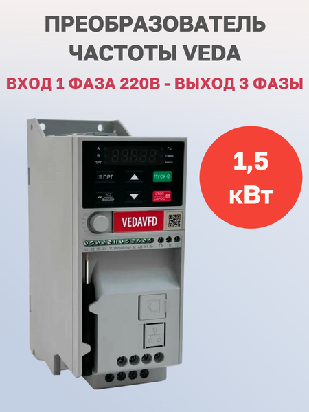 Частотный преобразователь VEDA VF-51-P1K5-0007-S2-E20-B-H - это устройство, предназначенное для управления скоростью вращения электродвигателей. Он обеспечивает плавное регулирование скорости, что позволяет улучшить качество работы оборудования и продлить его срок службы. Преобразователь частоты работает с электродвигателями до 1500 Вт 380 В. Это позволяет использовать его для управления различными типами двигателей, включая те, которые работают в сложных условиях. Устройство имеет степень защиты IP20, что обеспечивает его надежную работу в условиях повышенной влажности и пыли. Оно также оснащено защитой от перегрева, скачков напряжения и перегрузки, что гарантирует безопасность его использования. Преобразователь частоты оснащен панелью управления, что позволяет легко и быстро настроить его параметры. Подключение к системе управления осуществляется через RS-485 и MODBUS, что обеспечивает гибкость и удобство использования. Устройство имеет встроенный тормозной резистор, который обеспечивает быстрое и эффективное торможение двигателя. Это позволяет избежать износа и повреждений оборудования. VEDA VF-51-P1K5-0007-S2-E20-B-H имеет компактные размеры (202.0 х 163.0 х 75.0 мм) и небольшой вес, что делает его удобным для установки и использования в различных условиях. В целом, частотный преобразователь VEDA VF-51-P1K5-0007-S2-E20-B-H является надежным и функциональным решением для управления электродвигателями, обеспечивая их стабильную и эффективную работу.