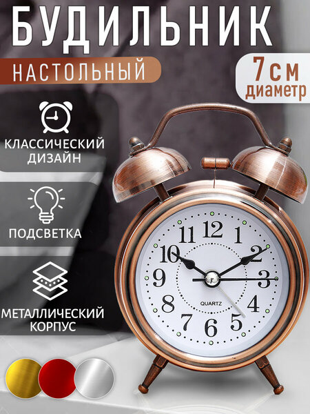 Чтобы утро было по-настоящему добрым, встречайте его с весёлым будильником. Классический дизайн будильника с металлическим молоточком и двумя колокольчиками впишется в любую обстановку. Питание осуществляется от 1 батарейки типа АА (пальчик). Встроенная подсветка включается кнопкой на задней панели. Тип хода стрелок прямой, тип механизма - бесшумный с плавным ходом. Материал: металл, стекло. Упаковка: картонная коробка с окошком. Размер упаковки: 127*60*90 мм. Размер будильника: 122*82*57 мм. Вес нетто: 162 гр.