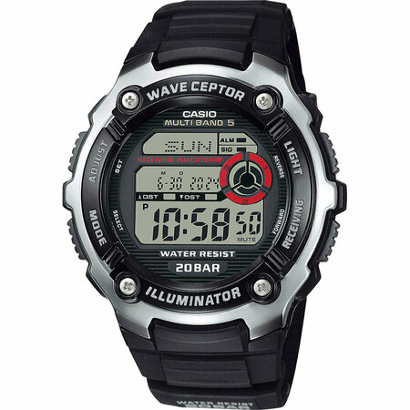 Мужские электронные часы. Электролюминесцентная подсветка. Прием сигналов радио-калибровки (Европа, США, Япония). Функция мирового времени. Функция секундомера с точностью 1/100 сек. и пределом измерения 1 час. Таймер. Ежедневный будильник. Многоязычность. Включение/выключение звука кнопок. Автоматический календарь. 12/24х часовой формат времени. Корпус выполнен из полимерного пластика серебристого и черного цветов и нержавеющей стали. Размер корпуса составляет 52,2 x 47,7 x 15,2 мм. Ремешок из полимерного материала, стандартная застежка. Прочное минеральное стекло устойчивое к мелким механическим повреждениям. Водостойкость WR 200 (погружение с аквалангом). Вес примерно 58 гр.