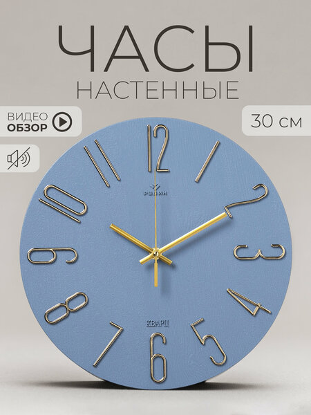Настоящая находка для любителей классики! Настенные часы, несомненно, добавят в Ваш интерьер оригинальный акцент. Эти часы большие на стену выполнены из прочного пластика, непременно создадут атмосферу уюта и гармонии. Большие голубые часы на стену — универсальный и эффектный вариант для любого помещения. Они выполнены из прочного и качественного пластика с фактурой дерева. Бесшумный механизм и плавный ход подойдут для тех, кто ценит тишину и спокойствие. Модель отлично впишется в любой интерьер кухни, зала или офиса за счет минимализма. Классическое сочетание синего и золотого цветов придает часам и помещению изысканный вид. Настенные часы в комнату - это не только полезный предмет, но и красивый элемент декора, который привлечет внимание Ваших гостей и семьи. Это отличный выбор как для просторных, так и для прихожей и небольших комнат дома, дачи или квартиры. Настенные часы - это то, что вам нужно, если вы хотите сделать свой дом уютнее и красивее, ведь для украшения своего дома, мы используем различные аксессуары, но настенные часы на стену давно стали не просто красивой деталью интерьера Часы-классика идеальны в качестве украшения или подарка вашему близкому. На декоративные часы нанесен циферблат. Стрелки — золотые, изящной формы. Цифры — крупные и стильные. Видеть время удобно с любого расстояния. Элемент питания — 1 батарейка АА (НЕ входит в комплект). Диаметр часов — 30 см. Произведено в России, проходит ОТК.
