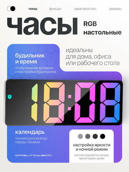 Комментарий:Визуально получила, что хотела🥰 Часики красивые, цвета яркие, можно менять режим цвета по настроению и под интерьер, циферблат не бликует, цифры четко видно издалека. Так же, есть будильник, дата. Из недостатков: 1) Настраивала интуитивно, инструкцию можно сразу выкинуть. 2)В нормальном режиме работают только от сети, на батарейках(новые, рабочие) через пару секунд гаснут. 3)Нет цифр белого цвета. 4)Будильник заведённый один раз, звонит каждый день в это же время(предстоит разобраться как отключить). В общем и целом на фоне цены, красоты и визуального качества часов, недостатки для меня не критичны, поэтому оценку снижать не буду