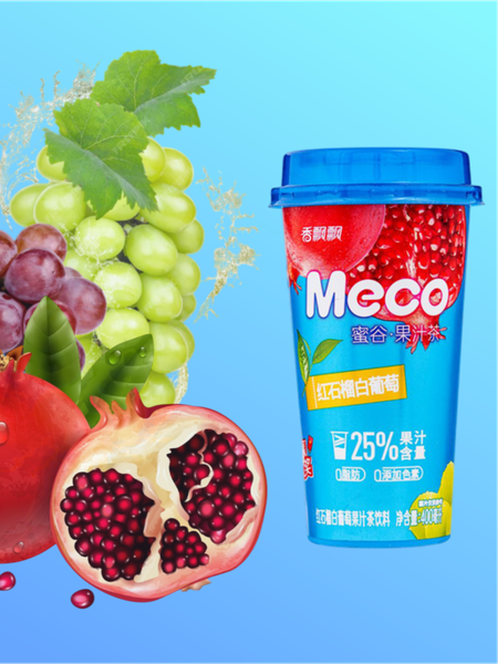 Молодой и амбициозный бренд MECO принадлежит китайской компании Сянпяопяо, основанной в 2005 году в провинции Чжэцзян. Под этим брендом производитель выпускает прохладительные напитки на основе натурального зеленого чая с добавлением фруктовых соков – в Китае их называют «Холодный фруктовый чай». Формат упаковки – удобные стаканы-непроливайки, чтобы можно было утолять жажду на ходу или не отрываясь от рабочего процесса. Лозунг бренда MECO: «Настоящий чай и настоящий сок». В каждой порции напитка – не менее 10% натурального сока фруктов или ягод. Фруктовые чаи рекомендуется пить охлажденными. Холодный фруктовый чай Meco в стаканчиках — это освежающий напиток, приготовленный на основе свежезаваренного чая улун с добавлением натуральных фруктовых соков. Чай Meco содержит витамины и антиоксиданты, которые поддерживают здоровье и укрепляют иммунитет. Удобная упаковка с красочным стаканчиком, защитной фольгой и складной трубочкой позволяет брать напиток с собой или подавать к столу. Холодный фруктовый чай из Китая. Сладкий вкус манго отлично сочетается с кислинкой гуавы. Холодный фруктовый чай Meco со вкусом винограда — это освежающий напиток, который сочетает в себе свежезаваренный чай улун, настоящий фруктовый сок и натуральные добавки. Вкус насыщенный и выраженный, с яркими нотами терпкого граната и сладкого винограда. Чай Meco упакован в стильный стаканчик из плотного картона с защитной фольгой, надёжной крышкой и складной трубочкой. Это позволяет удобно пить напиток в дороге или подавать его к столу. Чай Meco не содержит искусственных добавок и красителей, поэтому он полезен для здоровья. Холодный фруктовый чай из Китая. Терпкий вкус граната в сочетании со сладким виноградом киш-миш. Отлично утоляет жажду.