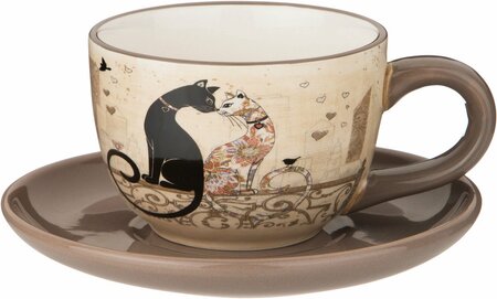 Париж… город любви, романтики и богемы. Нам очень захотелось подарить Вам частичку атмосферы этого города и именно для этого мы создали нашу эксклюзивную коллекцию посуды Парижские коты. Она выполнена на двух видах материалов: качественном фарфоре с толщиной стенок 1.5 мм и лёгкой доломитовой керамике со стенками 4 мм. Нежные бежевые тона, воздушные очертания Эйфелевой башни и базилики Сакре-Кёр, каменная брусчатка и главные герои наших зарисовок – символы Монмартра – коты. Чайная пара выполнена из доломитовой керамики и состоит из 2х предметов: 1 чашка и 1 блюдце. Чашка имеет объём 220 мл, диаметр блюдца 15 см. Прекрасный вариант сервировки уютного чаепития для себя или близкого Вам человека как дома, так и на работе. Грациозно изогнутые спинки, завитки гибких хвостиков, милые мордашки – наши Парижские коты истинные жители столицы Франции. Их прогулки по улицам, будуарам и парапетам запечатлены на тарелках, кружках, блюдах, салатниках, сахарницах, разнообразных подставках, менажнице, тортовнице, банках и блиннице из доломита. А маленькие птички, россыпь сердечек и цветочный орнамент завершают эту лёгкую, очаровывающую композицию. Все предметы коллекции поставляются в красочных картонных коробках с рисунками, повторяющими деколь посуды. Что позволяет с большим удовольствием презентовать их на любой праздник, будь то день рождения, новый год, свадьба, 8 марта или же как простой знак внимания. Изделия из доломита не рекомендуется мыть в посудомоечных машинах и использовать в микроволновых печах, но яркость деколи на этом материале и его экологичность компенсируют эти недостатки. Эта серия создана для того, чтобы внести в Ваш дом немного мечтательности и поэтичности. Послужит украшением Вашего стола и интерьера. Мы с нетерпением ждём, когда Вы присоединитесь к «прогулке» по романтичным улицам города в компании наших знаменитых Парижских котов и с радостью улыбнётесь.
