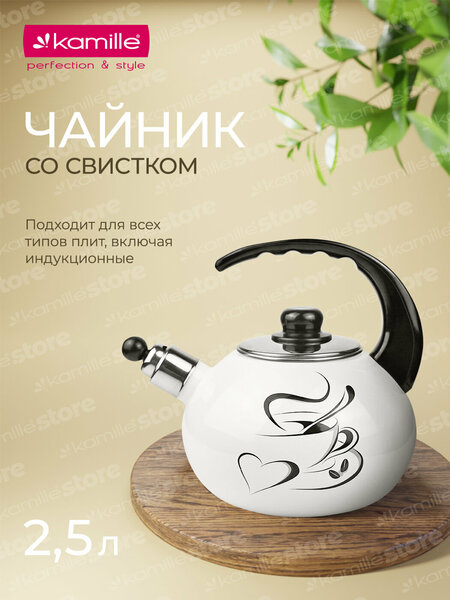 Чайник 2,5 л. эмалированный со свистком Kamille KM 1036 с черной бакелитовой ручкой (2,5 л. / белый)
