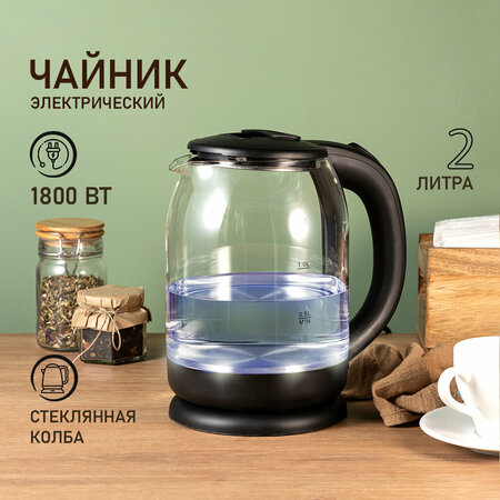 Электрический чайник вскипятит большой объем воды за считанные минуты. Корпус выполнен из стекла в комбинации с качественным пищевым пластиком, что обеспечивает долгий срок службы. Нагревательный элемент и крышку дополнительно защищает высококачественная нержавеющая сталь. Кроме того, электрочайник легко мыть. Благодаря универсальному дизайну он подойдет для кухни в любом стиле. Крышка чайника открывается нажатием кнопки, которая расположена на теплоизоляционной ручке. Чтобы начать подогрев воды, необходимо нажать кнопку на корпусе. Прибор отключится автоматически при закипании или недостаточном количестве жидкости. Такая опция защитит чайник от короткого замыкания и перегрева. Закрытый нагревательный элемент также обеспечивает безопасное использование техники для кухни. Электрочайник оснащен защитой от включения без воды. Специальные отверстия в носике чайника способствуют выходу пара и препятствуют образованию конденсата. Электрический чайник нагревается быстрее, чем чайники для плиты. Чайник оснащен безопасной нескользящей ручкой и широкой крышкой с защитой от ожогов, через которую удобно заливать воду. Чайник одним движением устанавливается на подставке и при необходимости его можно повернуть на 360 градусов. Объем чайника - 2 л, мощность - 1800 Вт.