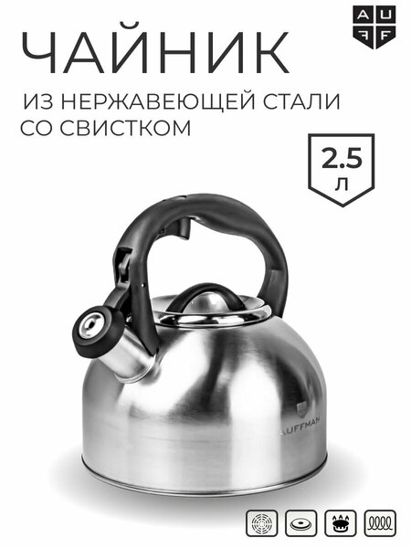 Чайник AUFFMAN из нержавеющей стали со свистком 3л - это высококачественный и практичный выбор для любителей горячих напитков. Он подходит для всех видов плит, включая индукционную, и станет незаменимым помощником на отдыхе на природе. Корпус чайника выполнен из нержавеющей стали, что обеспечивает долговечность и сохранение отличного внешнего вида. Трехслойное термоаккумулирующее дно обеспечивает быстрое нагревание воды и длительное сохранение тепла без дополнительного подогрева. Эргономичная комбинированная ручка с покрытием "soft-touch" и бакелитовая ручка с прорезиненным покрытием обеспечивают удобство и безопасность использования. Ручка остается прохладной на ощупь даже при кипячении воды, что делает ее безопасной и удобной в использовании. Чайник оснащен свистком, который оповестит вас о закипании воды. Крышка чайника выполнена из алюминия и имеет отверстие для удобного слива воды. Чайник можно мыть вручную, без использования чистящих и моющих средств для посуды. После мытья его необходимо протереть сухим мягким полотенцем. Чайник поставляется в подарочной коробке, что делает его отличным подарком для себя или своих близких по любому поводу или празднику. Выбирая чайник нержавеющий со свистком AUFFMAN 2,5 литра, вы получаете высококачественный, практичный и стильный аксессуар для приготовления и заваривания горячих напитков.