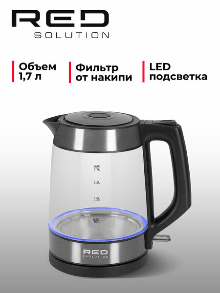 Стильный и компактный дизайн Электрочайник RED evolution RK-G20 — это стильное и компактное устройство для любителей горячих напитков. Прибор поместится даже на маленькой кухне за счет небольших размеров и специального отсека для электрошнура. Корпус выполнен из жаропрочного стекла, нержавеющей стали и пластика. Это современно смотрится и гарантирует, что чайник долго будет выглядеть, как новый. Мощность и быстрый нагрев Электрический чайник мощностью 1800 – 2200 Вт быстро вскипятит воду для чая или кофе. Дисковый нагревательный элемент гарантирует быстрый и равномерный нагрев воды. За 2-3 минуты вы получите желаемый результат. Безопасность и контроль Больше не нужно переживать, что забыли выключить чайник. Максимальная безопасность обеспечивается функциями автоотключения при: • закипании; • отсутствии воды; • снятии с базы. Удобство использования Широкая горловина, съемный фильтр от накипи и вращение на 360º делают использование чайника и уход за ним удобнее и проще. Внутренняя подсветка колбы зажигается при включении чайника и выключается при закипании воды. Эргономичная ручка позволяет держать чайник на весу без напряжения в руке, а с помощью специальной кнопки на ручке можно быстро открыть крышку. Гарантия 12 месяцев Купить чайник RED evolution RK-G20 значит выбрать качество, поэтому на устройство идет гарантия на 12 месяцев. Будьте спокойны за надежность и долговечность прибора с RED evolution. Почувствуйте инновации — переходите на RED!