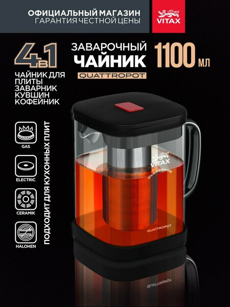 Заварочный чайник Vitax Quattropot объемом 1,1 литра представляет собой уникальное сочетание функциональности и эстетики. Чайник изготовлен из жаропрочного стекла, что позволяет использовать его не только на плите, но и в микроволновой печи. Это делает его незаменимым помощником на кухне, позволяя готовить напитки в любых условиях. Дизайн чайника выполнен в лаконичном стиле, что делает его подходящим для любого интерьера кухни. Квадратная форма с плавными обводами делает его изящным и невесомым. Прозрачное стекло, наполненное волшебным эффектом преломления света, превращает чаепитие в удивительное по красоте зрелище. Чайник оснащен ситечком из нержавеющей стали и термоизолированной ручкой, что обеспечивает удобство и безопасность использования. Подставка из термостойкого силикона гарантирует стабильность чайника на любой поверхности. Силиконовую подставку необходимо снимать перед помещением чайника на плиту для разогрева. Чайник можно мыть в посудомоечной машине, что значительно облегчает уход за ним. Объем чайника составляет 1,1 литра, что позволяет приготовить достаточное количество напитка для большой компании. Выбирая заварочный чайник Vitax Quattropot, вы получаете не только функциональный, но и стильный аксессуар для вашей кухни.