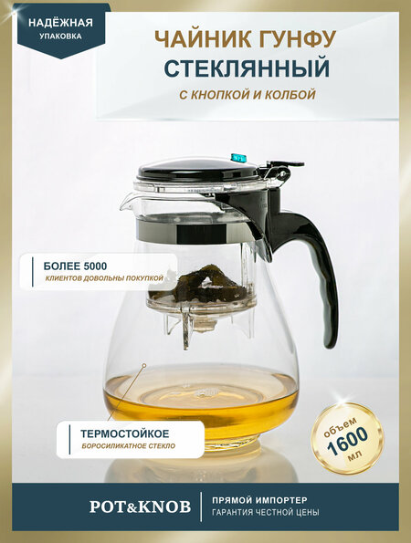 Чайник Типод Гунфу из боросиликатного стекла с колбой и кнопкой очень удобен для заваривания чая, травяных напитков, и фруктовый смесей. Самая главная отличительная особенность этого типота от других заварочных чайников, в том, что крепость и насыщенность настоя Вы можете регулировать сами. Вам нужно засыпать нужное количество Вашего напитка в верхнюю колбу и залить туда кипяток, после чего нужно нажать кнопку, настой напитка уже фильтруется в стеклянный сосуд. Всего 3 действия (засыпать, налить, нажать) и Ваш напиток готов к употреблению. Настой всегда будет чистый, ведь заварка остается сверху в колбе, и никогда не попадет к Вам в чашку. В этом и есть его главное достоинство. Колба для заваривания очень легко моется и не нужно ее разбирать дополнительно. Также колба имеет специальный механизм крепления с стеклянным чайником, что очень удобно при разливании напитка в чашки. К этому чайнику отлично подойдут чашки из двойного стекла (Вы можете выбрать их ассортименте нашего магазина), у них оптимальный объём для этого типода (155 мм и 220 мм). Если нужен объём больше, то в нашем магазине представлена кружка из двойного стекла на 350 мл. Рекомендации по завариванию чая и напитков дополнительно указаны на коробке из под стеклянного чайника. Приятного чаепития.