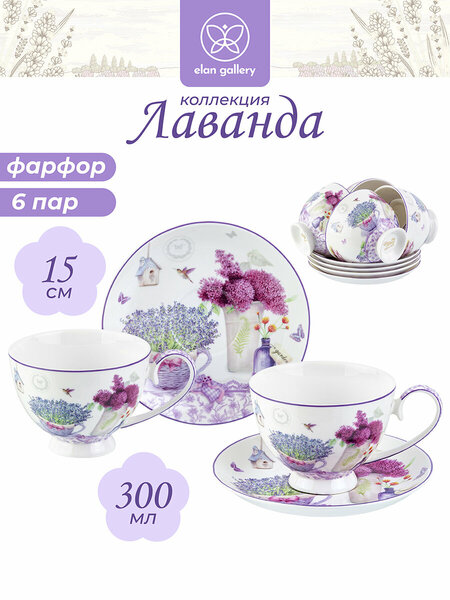 Чайная пара, чашка с блюдем 12 предметов 300 мл Elan Gallery "Лаванда", набор