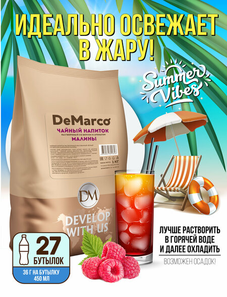Чай с малиной - напиток, который в России пьют в любое время года. Чай быстрорастворимый легко и быстро заваривается, с ароматом настоящей малины. Малина содержит в себе необходимые витамины: С, витамины группы В и другие витамины, способствующие укреплению иммунитета. Попробуйте чай DeMarco и убедитесь, что он обладает вкусом и ароматом классического чая. Чайный напиток можно употреблять и в холодном, и в горячем виде. Компания DeMarco занимается производством кофе и кофейных напитков премиум-класса с 2009 года, управляет всей производственной цепью: импорт зелёного кофе, составление оригинальных купажей и обжарку кофейных зерен с использованием передовых технологий. Компания DeMarco занимает лидирующие позиции в России и в странах ближнего зарубежья по продажам кофе для кофеен и вендинговых аппаратов.