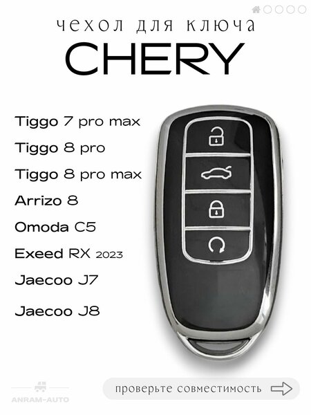 Чехол для ключа Chery Tigo 8 Pro, 8 Pro max, 7 Pro max, Arrizo 8, Exeed RX, Jaecoo J7 и OMODA C5 (черный) - это стильный и удобный аксессуар, который обеспечит надежную защиту вашего автомобильного ключа. Этот чехол выполнен специально для ключей моделей Chery Tigo 8 Pro, 8 Pro max, 7 Pro max, Arrizo 8, Exeed RX, Jaecoo J7, OMODA C5, обеспечивая идеальную посадку и защиту от царапин, потертостей и повреждений. Чехол изготовлен из качественного материала, который обеспечивает долговечность и сохраняет первоначальный внешний вид ключа. Его черный цвет придаст элегантности вашему ключу и подчеркнет ваш стиль. Простота установки и снятия, а также удобство в использовании делают этот чехол отличным выбором для защиты вашего автомобильного ключа. Приобретите чехол на ключ черри тигго 8 про, черри тигго 8 про макс, черри тигго 7 про макс, черри арризо 8, Эксид РХ, джейку джи7 и омода с5 (черный) прямо сейчас, чтобы дополнить ваш аксессуар автомобильным стилем и защитить ваш ключ от повреждений. Чехол для ключа автомобиля может быть прекрасным сувениром, который можно дарить как подарок мужу, жене, другу, парню, девушке или подруге. Перед покупкой проверьте, соответствует ли Ваш автомобильный ключ предлагаемому чехлу (Фото смарт-ключа представлен на слайде)