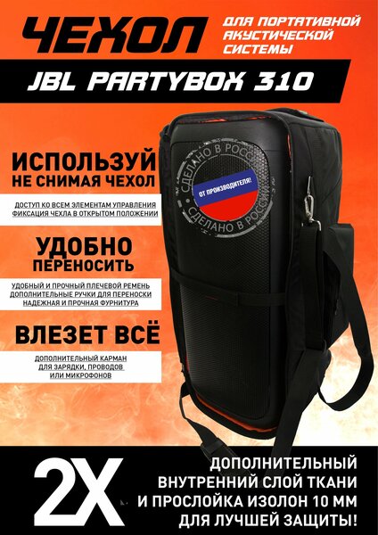 Защитный чехол-сумка предназначен для перевозки/переноски и использования акустической системы JBL Partybox 310. Такой чехол надёжно защитит систему от попадания пыли, грязи и влаги. Модель выполнена из прочного материала(Oxford 1680), рассчитанного на продолжительный срок службы при частом использовании. Противоударный уплотнитель 10 мм. (полипропилен) надежно защитит от ударов и падений. Чехол легко надевается и снимается, а благодаря специальной лямке он плотно сидит и не сдвигается при расположении системы в любом положении. Передняя крышка чехла имеет надежный замок-молнию. Специальные отверстия с крышками на липучках позволяют получить доступ ко всем элементам управления акустической системой и использовать систему не снимая чехла. Боковые ручки и плечевой ремень делают переноску более удобной. Для дополнительных аксессуаров(микрофоны, зарядное устройство и др.) предусмотрен боковой карман с застежкой на молнии.