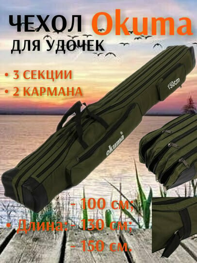 Чехол для удочек. Три отдельных отделения на молнии и два кармана на молниях. Изготовлен из непромокаемого материала высокой прочности. Качественные молнии. Ручки для удобства переноски в руках и на плече. Водостойкость, мм в. ст. 1500.
