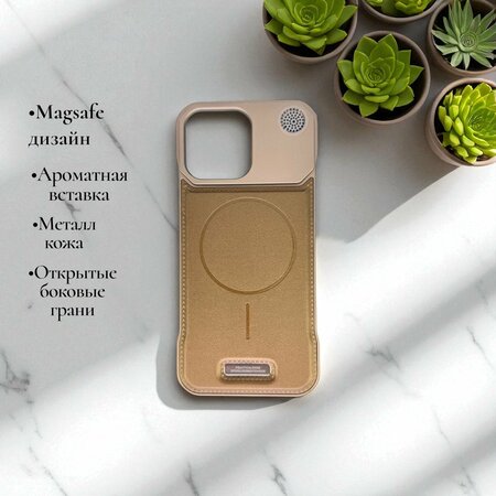 Чехол MetallAroma — это сочетание стиля, аромата и защиты в одном аксессуаре. Верхняя часть выполнена из прочного металла, который придаёт корпусу премиальный вид и устойчивость к повреждениям. Нижняя часть — из качественной эко-кожи, мягкой на ощупь и приятной в использовании. Главная особенность — встроенная ароматическая вставка. В области верхней части чехла предусмотрено небольшое отверстие, прикрытое защитной плёнкой: за ней скрывается тонкий, ненавязчивый парфюмерный аромат, который создаёт приятное ощущение свежести каждый раз, когда вы берёте телефон в руки. Чехол поддерживает MagSafe-дизайн, что позволяет удобно использовать магнитные аксессуары и беспроводную зарядку. Открытые боковые грани обеспечивают лёгкий доступ ко всем кнопкам, не нарушая эргономику устройства. Если вы ищете не просто защиту, а аксессуар с изюминкой — MetallAroma станет идеальным выбором.