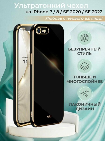 Чехол на iPhone 7 / 8 / SE 2020 защитный силиконовый бампер на айфон 7 / 8 / SE 2022 с золотой рамкой Черный