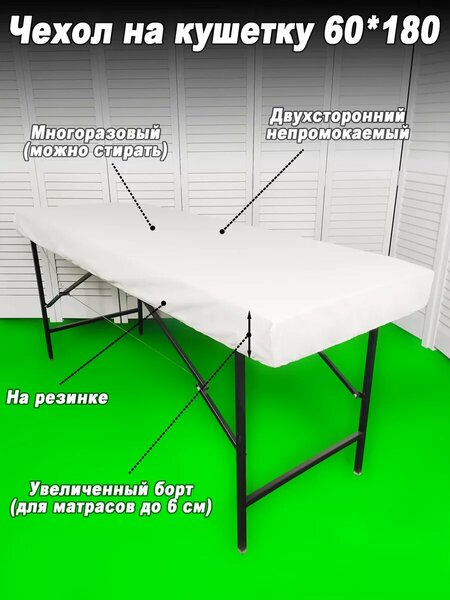 Чехол на кушетку 180х60 (массажный стол) на резинке преобразит и защитит вашу кушетку. Защитный чехол для кушетки многоразовый из мулетона имеет увеличенный борт для того, чтобы под чехол можно было положить матрас на кушетку косметологическую толщиной до 6 см. Мулетон - это уникальный материал, с лицевой стороны он похож на махровую ткань, а с внутренней прорезиненый непромокаемый пвх материал. Чехол махровый двухсторонний прекрасно тянется и его можно стирать. По периметру вшита резинка (чехол на кушетку на резинке) для того, чтобы он был зафиксирован и хорошо сидел на кушетке. внимание: поролоновый матрас-вкладка в комплект не входит.