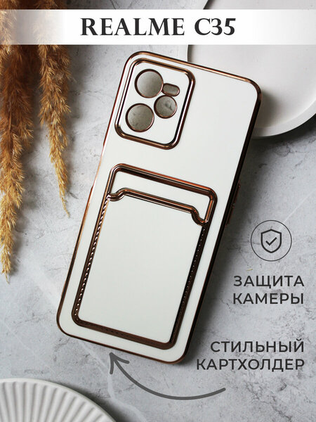 Чехол на Realme C35 с золотой рамкой противоударный бампер с карманом для карт на реалми с35 Белый