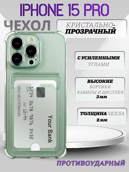 Прозрачный силиконовый чехол с карманом (с отверстием) для пластиковых / банковских карт на iPhone 15 Pro / Айфон 15 Про - стильный чехол премиум качества. Многофункциональный чехол с усиленными углами и бортиками, для более надежной защиты вашего телефона. Противоударные углы, при падении на твердую поверхность, амортизируют и поглощают весь удар. На кармане расположено специальное отверстие для пальца - вырез, который позволяет удобно достать карту. Карман идеально подходит для хранения и использования пластиковых карт: банковской, проездного, социальной карты, пропуска, карты школьника, учащегося и других часто используемых документов. Чехол с держателем карт - удачное решение, когда нет возможности бесконтактной оплаты через смартфон. Защитные бортики вокруг камеры сохранят ваш телефон от повреждений. Защита камеры предотвратит появление царапин. Защитный чехол с картхолдером iphone 15 pro выполнен из прочного износостойкого силикона. Накладка легкая и не увеличивает габариты устройства, не скользит в руке, удобна при использовании и совместима со всеми защитными стеклами. Прозрачная накладка не маркая, легко моется или протирается салфеткой. Точные вырезы для камеры, разъемов и динамиков. Все кнопки закрыты, во избежание попадания пыли и грязи. Комфортно нажимаются, без лишних усилий. Чехол кейс с отделением для карт на айфон 15 про подчеркнёт все достоинства смартфона. Он легко надевается и снимается, гибкий, упругий. Дизайн и точность подгонки под модель телефона обеспечивают идеальную посадку и эстетичный внешний вид. Благодаря упругости материалов, чехол защищает смартфон от излишнего негативного воздействия, механических повреждений, ударов, сохраняя при этом свою целостность. Стильный, лаконичный дизайн. Case с дополнительным функционалом в виде кармашка, визитницы. Отличный и практичный подарок для Вас и ваших близких на все праздники: на 23 февраля, 8 марта, день Святого Валентина, папе, мужу, коллеге, другу/подруге, брату/сестре.