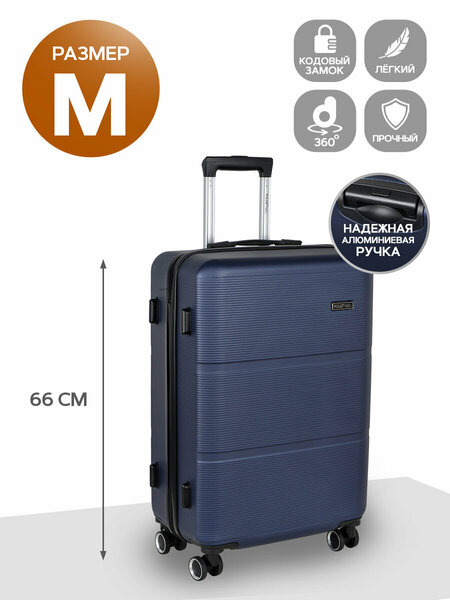 Чемодан фирмы POLAR, размер М, выполнен из пластик ABS. Основное отделение разделено на две части. Одно имеет фиксирующие ремни, второе на молнии. Выдвигающаяся ручка расположена внутри корпуса чемодана, что способствует большей прочности и защите от ударов при разгрузке/погрузке чемодана. Выдвигающаяся ручка фиксируется в двух положениях. Есть кодовый замок. Надежные 4 колеса.