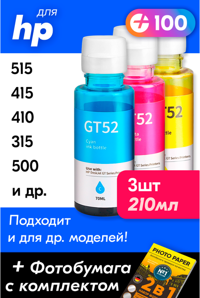 Чернила для HP GT52, на принтер HP Smart Tank 515, 500, 516, 530, 580, Ink Tank 415, 410, 315, DeskJet GT5810, GT5820 и др, 3 шт. Краска для заправки струйного принтера,