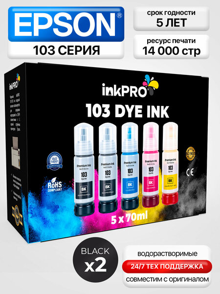 Краска для принтера EPSON 103 на водной основе (dye ink) из 4 цветов для заправки оригинальных и совместимых картриджей, системы непрерывной подачи чернил (СНПЧ), перенаправляемых картриджей (ПЗК) струйных принтеров. В увеличенном наборе 4 флакона в вакуумной упаковке по 70 мл каждая, черный цвет (BK) 2 шт, голубой (C), желтый (Y) и пурпурный (M). Комплект чернил рассчитан для печати 14 000 страниц А4. Чернила для принтера epson 103 гарантируют отличное качество печати на документах и фотобумаге. Флаконы оснащены специальным встроенным клапаном «Ink Lock» — ни капли мимо, защищающим от случайного проливания. Чернила можно смешивать и доливать к оригинальным чернилам. Набор красок 103 совместим с моделями принтеров EPSON серии EkoTank; L1110, L1210, L1250, L3100, L3101, L3110, L3111, L3118, L3150, L3151, L3156, L3160, L3200, L3210, L3211, L3218, L3250, L3251, L3256, L3258, L3260, L3262, L3266, L3550, L3558, L3560, L4150, L4160, L4167, L4260, L4266, L4268, L4269, L5190, L5290, L5296, L5298, L5590, L6160, L6170, L6190, L6270, L6290, L7160, L7180 и др. Чернила в принтер epson обладают отличной цветопередачей и безопасностью для эксплуатации принтера епсон. Краска 103 на epson обеспечивает отличное качество печати, обладает высокой стойкостью к выцветанию и не вызывает проблем с печатью. Краска для эпсон 103 прошла контроль качества и сертификацию ISO 9001, REACH, RoHS и СЕ. Чернила INKPRO 103 оптимальный выбор для надежной работы принтера EPSON и качественной печати.