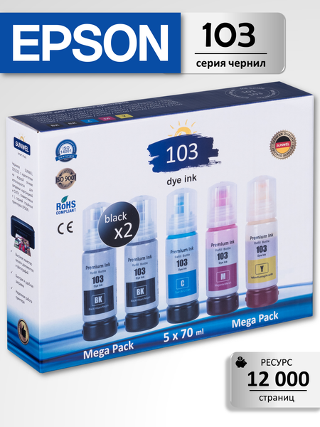 Краска для принтера EPSON 103/101 на водной основе (dye ink), набор 5х70 мл. Эти чернила подходят для заправки оригинальных и совместимых картриджей, системы непрерывной подачи чернил (СНПЧ), перенаправляемых картриджей (ПЗК) струйных принтеров. В наборе 5 флаконов по 70 мл, черный цвет (black) - 2 шт, голубой (cyan), желтый (yellow) и пурпурный (magenta). Комплекта чернил хватает для печати 12000 страниц А4. Чернила для принтера epson 103 гарантируют отличное качество печати на документах и фотобумаге. Процесс пополнения чернильных емкостей стал еще удобнее и быстрее. Чернильные контейнеры оснащены специальным встроенным клапаном «Ink Lock» — ни капли мимо, защищающим от случайного проливания. При установке контейнера в отверстие для заправки клапан открывается, и чернила начинают поступать в систему печати. Как только вы вынимаете контейнер из заправочного отверстия — клапан закрывается, и чернила остаются внутри, даже если контейнер перевернут. Совместимые модели струйных принтеров и МФУ EPSON EcoTank: L1110, L1210, L1250, L3100, L3101, L3110, L3111, L3118, L3150, L3151, L3156, L3160, L3200, L3210, L3211, L3218, L3250, L3251, L3256, L3258, L3260, L3262, L3266, L3550, L3560, L4150, L4160, L4167, L4260, L4266, L4268, L4269, L5190, L5290, L5296, L5590, L6160, L6170, L6190, L6290, L7160, L7180 и др. Водорастворимые (dye ink) чернила для принтера epson 103 очищены методом многоуровневой фильтрации. Состав: вода, краситель, регуляторы вязкости и текучести. При соприкосновении с бумагой чернила епсон 103 мгновенно впитываются. Улучшенная формула чернил способствует продлению срока службы принтера. Краска для принтера эпсон 103 прошла контроль качества и сертификацию ISO 9001, ISO 14001, REACH, RoHS и СЕ. Срок хранения контейнеров составляет 5 лет. Каждый флакон имеет вакуумную упаковку. После открытия рекомендуется хранить контейнер в вертикальном положении и использовать в течение 6 месяцев. Чернила можно доливать и смешивать с остатком оригинальных чернил EPSON 103, 101, 003, 004 и 001. Контейнеры с чернилами стоят значительно дешевле аналогичных картриджей, при этом чернил в контейнерах больше, чем в картриджах. Не ограничивайте себя в печати, с технологией «Epson EcoTank» вы получаете больше чернил за меньшие деньги. Печатайте до 3-х лет без покупки расходных материалов. Краска в принтер SUNWEL 103 - оптимальный выбор для надежной работы принтера EPSON и качественной печати.