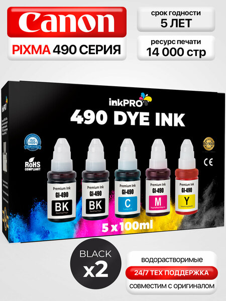 Краска GI-490 на водной основе (dye ink) для струйных принтеров CANON. Увеличенный набор из 4 цветов. Чернила подходят для заправки оригинальных и совместимых картриджей, системы непрерывной подачи чернил (СНПЧ), перенаправляемых картриджей (ПЗК) струйных принтеров. В увеличенном комплекте 5 флакона в вакуумной упаковке по 100 мл, черный цвет (BK) 2 шт, голубой (C), желтый (Y), пурпурный (M) по одной штуке. Комплекта чернил хватает для печати 14000 страниц А4 при заполнении краской 5%. Чернила для принтера canon GI-490 гарантируют отличное качество печати на документах и фотобумаге. Краски для принтера canon 490 подходят к моделям струйного принтера CANON PIXMA GI-490 G1400, G1410, G1411, G1416, G1810, G2010, G2400, G2410, G2411, G2415, G2430, G2810, G2820, G3010, G3020, G3400, G3410, G3411, G3415, G3416, G3460, G4400, G4410, G4411, G5040, G6040 и др. Чернила для принтера можно доливать и смешивать с остатком оригинальных чернил кенон. Чернила в принтер canon обладают отличной цветопередачей и безопасностью для эксплуатации принтера канон. Краска на canon pixma обеспечивает высокое качество печати, обладает высокой стойкостью к выцветанию и не вызывает проблем с печатью. Краска для canon pixma Gl-490 прошла контроль качества и сертификацию ISO 9001, REACH, RoHS и СЕ. Чернила INKPRO 490 - оптимальный выбор для надежной работы принтера CANON и качественной печати.