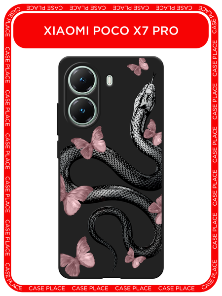 Черный матовый чехол на Poco X7 Pro / Поко X7 Про с принтом Змейка с бабочками