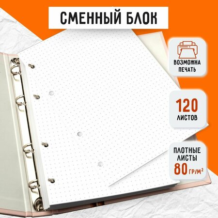 Этот сменный блок для тетради на кольцах формата А5 станет незаменимым помощником для школьников и студентов. Он выполнен из качественной офсетной бумаги плотностью 80 г/м2, что обеспечивает комфортное письмо и долговечность. Особенностью данного товара является его разлиновка в точку. Это позволяет четко и аккуратно записывать информацию, не отвлекаясь на поля. Формат блока составляет 148 x 210 мм, что делает его удобным для использования в тетрадях и ежедневниках с 4 кольцами. Расстояние перфорации между кольцами составляет 45-65-45 мм, что позволяет легко менять листы и добавлять новые записи. Блок предназначен для письма различными ручками: гелевыми, шариковыми, капиллярными и перьевыми. Это обеспечивает комфорт и удобство при использовании. Обложка блока выполнена из мягкой бумаги, что делает его легким и удобным для переноски. Целевая аудитория данного товара - взрослые и дети.