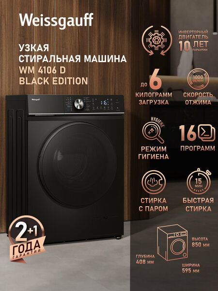 Cтиральная машина с инвертором и паром Weissgauff WM 4106 D Black Edition, Загрузка 6 кг, Отжим 1000 оборотов
