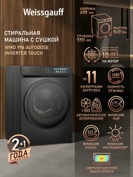 Отдельностоящая стиральная машина Weissgauff с функцией сушки, оснащенная инверторным двигателем и функцией пара, имеющая показатели загрузки до 11 кг белья при стирке и до 7 кг белья при сушке, скорость отжима до 1400 оборотов в минуту, а также цветной дисплей SMART SCREEN и функцию автодозирования - это одна из наиболее передовых моделей Weissgauff в категории стиральных машин! Серия PREMIUM создана Weissgauff, чтобы удовлетворить самые взыскательные запросы наших наиболее требовательных клиентов. Бесспорно высшее качество, расширенная функциональность и богатая комплектация, улучшенные показатели и доведенный до совершенства дизайн – все это вы найдете в моделях данной серии, воплощающих самые смелые мечты в реальность. Прикоснитесь к поистине легендарному уровню исполнения бытовой техники Weissgauff с моделями PREMIUM! Инверторный двигатель - созданный по особой технологии, использующей электромагнитное поле для вращения барабана (без применения щёток), что значительно снижает уровень шума, износа и энергопотребления. Цветной дисплей SMART SCREEN с сенсорным управлением отражает всю современность и технологичность подходов Weissgauff к созданию своих устройств, делая процесс взаимодействия с данной моделью ещё более простым и удобным! Автоматическое дозирование I-DOS - позволит стиральной машине самостоятельно добавить нужное количество средства для стирки в зависимости от веса белья. Вам не потребуется лишний раз контактировать с бытовой химией - система I-DOS сохранит ваше здоровье. Качество стирки каждый раз будет высочайшим, а на белье никогда не будет пятен от излишка порошка - ведь система I-DOS самостоятельно подберет нужное количество моющего средства, не больше и не меньше! Это также позволит вам ощутить существенную выгоду, ведь расход моющего средства теперь будет оптимизирован! Программа "Стирка с паром" в данном режиме пар может глубоко проникать в волокна ткани, эффективно устраняя бактерии и микробы, предотвращая неприятные запахи и защищая Ваше здоровье Функция Ультрафиолет - обработка ультрафиолетом обеспечивает дополнительную гигиеническую чистоту как самого белья, так и внутренней поверхности барабана стиральной машины! Класс энергоэффективности A+++ позволяет с уверенностью говорить о том, что данная стиральная машина обеспечит отличный результат при каждой стирке белья, затрачивая при этом минимум электроэнергии! Загрузка до 11 килограммов - благодаря которой вы справитесь за один цикл со всем необходимым объёмом белья! Режим "Сушка" до 7 килограммов позволит запустить цикл просушивания белья, благодаря чему эта стиральная машина поможет вам получить не только чистые и постиранные вещи, но также и высушить их для того, чтобы убрать в шкаф или сразу надеть на себя! Скорость отжима до 1400 оборотов в минуту позволит существенно сократить время на дальнейшую сушку вашего белья! Режим Быстрая 15' минут- это по-настоящему фантастическая программа для тех, кто умеет ценить своё время! Умная стирка - это интеллектуальная программа, которая может быть введена и запущена автоматически в режиме ожидания. В рамках программы температура стирки, уровень воды и время стирки автоматически устанавливаются в соответствии с результатами взвешивания белья, и пользователю не нужно устанавливать параметры стирки самостоятельно Режим Стирка + Сушка 60' м