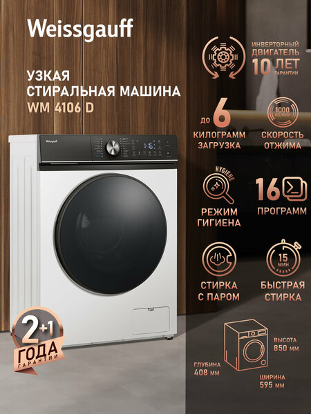Отдельностоящая стиральная машина Weissgauff, имеющая достойные показатели загрузки до 6 кг белья и скорости отжима до 1000 оборотов в минуту, а также большой цифровой дисплей с наглядной индикацией для выбора специальных возможностей и программирования установок - это настоящее сочетание отличного качества и разумной цены! Режим "Быстрая стирка" 15 минут - это по-настоящему фантастическая программа для тех, кто умеет ценить своё время! Загрузка до 6 килограммов - это поистине впечатляющий показатель для стиральных машин, благодаря которому вы справитесь за один цикл со всем необходимым объёмом одежды. Скорость отжима до 1000 оборотов в минуту позволит существенно сократить время на дальнейшую сушку вашего белья. Режим "Детская одежда" добавляет дополнительное полоскание, что особо важно при защите нежной кожи от остатков моющего средства. Программа "Стирка с паром" в данном режиме пар может глубоко проникать в волокна ткани, эффективно устраняя бактерии и микробы, предотвращая неприятные запахи и защищая Ваше здоровье. Режим Гигиена обеспечивает высокий уровень очистки благодаря длительному нагреву и дополнительному этапу полоскания, что особенно актуально для стирки белья, требующего интенсивной, противоаллергической и гигиенической очистки при высокой температуре. Функция "Моя программа" позволит создать и сохранить в память машины новый режим работы с бельём, на основе выбранных вами параметров. Класс энергоэффективности A+++ позволяет с уверенностью говорить о том, что данная стиральная машина обеспечит отличный результат при каждой стирке белья, затрачивая при этом минимум электроэнергии. Таймер отложенного старта, благодаря которому вы сами можете выбирать время начала работы с отсрочкой от 0 до 24 часов Режим очистки барабана обеспечит максимальную простоту в уходе за стиральной машиной, сохраняя ваше время и силы для более важных дел. Блокировка от детей защитит вашу стиральную машину от незапланированного включения детьми или случайного включения при очистке панели управления. Тихий режим станет идеальным решением для стирки в ночное время. После его активации все электронные звуковые сигналы будут отключены, позволяя запустить программу стиральной машины без дополнительных звуковых уведомлений.