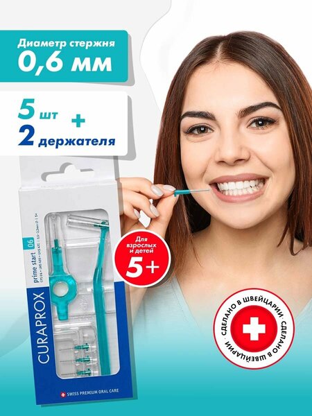 Межзубные ершики для зубов Curaprox Prime Start CPS 06 - это миниатюрные щеточки, предназначенные для очистки боковых поверхностей зубов. Эффективная гигиена полости рта, и особенно, при наличии увеличенных промежутков между зубами и использовании ортодонтических систем, мостов, брекетов, имплантов. В данной упаковке Вы также найдете маленький держатель UHS 409 и угловой держатель UHS 470. Ультратонкие нейлоновые щетинки антибактериальные очищают каждый дюйм межзубного пространства эффективно и без риска травм. Они настолько эффективны, что достаточно один раз провести приспособлением. Снижают риск разрушения зубов. Благодаря универсальной системе щелчков любая головка Curaprox поместится в любой из двух держателей. У зубов есть 5 поверхностей. Зубная щетка эффективно очищает 3 из них: переднюю, внутреннюю и жевательную. А боковые поверхности (межзубные промежутки) остаются нетронутыми. Если их не очищать, постепенно налет будет накапливаться: со временем это приведет к воспалению и развитию кариеса. Опасность последнего заключается в том, что он обычно поражает два зуба одновременно, кроме того, долгое время остается незаметным, пока не станет глубоким. Вооружившись миниатюрным помощником, и как дополнение к зубной щетке, значительно снижается вероятность развития таких стоматологических заболеваний. Ёршик из медицинского силикона позволяет удалять бактериальный налет, заменят зубную нить / флосстик и зубочистки. Зубная щетка не может добраться в труднодоступные участки. Именно здесь начинается множество стоматологических заболеваний кариес, пульпит. Ершик межзубный, силиконовый безопасен имеет мягкую жескость, стержень имеет мягкое силиконовое покрытие диаметром 1 мм. Набор ершиков в пластиковой индивидуальной упаковке удобно взять с собой в дорогу, компактный контейнер, футляр всегда под рукой, как дорожный набор на природе, в ресторан, как уход и профилактика полости рта, необходимы для брекет систем, для взрослых и детей , ершики не заменимы для чистки зубов для брекетов не травмируют десна, набор межзубной ершик профилактика и атрибут здоровье красота. Отличная альтернатива дорогостоящим ирригаторам, которые не всегда возьмешь с собой в путешествие в отличии от межзубных ершиков. Ершики межзубные 0,6 - миниатюрные щетки предназначены для чистки межзубного пространства, с их помощью можно с легкостью убрать налет из всех углублений и ямок, в отличии от зубочисток не травмируют десна и имеют множество преимуществ. Если человек купит зубной ершик, и добавит его в свою обычную гигиену к зубной щетке вечером, и днем, после приема пищи, не прогадает! Это приспособление тут же станет его любимым помощником, который после каждой трапезы быстро удаляет пищевые отложения и убирает зубной налет. Ортодонтический набор делает гигиену полости рта более качественной и пригодится абсолютно любому человеку! Ершик для зубов всегда должен быть с собой, и применяться после еды и вечером. Показания для применения зубочистки с ершиком: очистка от остатков пищи; проникновение в маленькие щели; устранение неприятного запаха изо рта; предотвращение кариозных образований и появление гингивита; очистка пародонтального кармана, где больше всего скапливаются бактерии; удаление налета из труднодоступных межзубных промежутков; чистка встроенных ко
