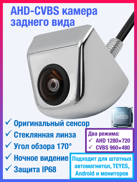 Камера заднего вида металлическая для автомобиля с поддержкой AHD - это инновационный продукт, который повышает безопасность водителя при движении задним ходом. Она оснащена высококачественной матрицей с разрешением до 1440x720 пикселей, которая обеспечивает четкое изображение на экране автомобиля. Камера имеет широкий угол обзора 170 градусов, что позволяет водителю видеть все объекты, находящиеся позади автомобиля. Одной из главных особенностей камеры заднего вида для авто является ее простота установки и использования. Она легко крепится на заднюю часть автомобиля, а затем подключается к экрану внутри салона. Кроме того, камера заднего вида автоматически включается при переключении на заднюю передачу, что делает ее использование максимально удобным. Этот продукт идеально подходит для всех, кто хочет обеспечить безопасность при движении задним ходом, в том числе для водителей грузовиков, автобусов и других транспортных средств. Камера заднего вида для автомобиля Это надежный и качественный продукт, который обеспечивает безопасность на дороге. Поддержка магнитолой формата CVBS 480 и AHD 720 на автомагнитолы! Главные преимущества перед другими камерами заднего вида: