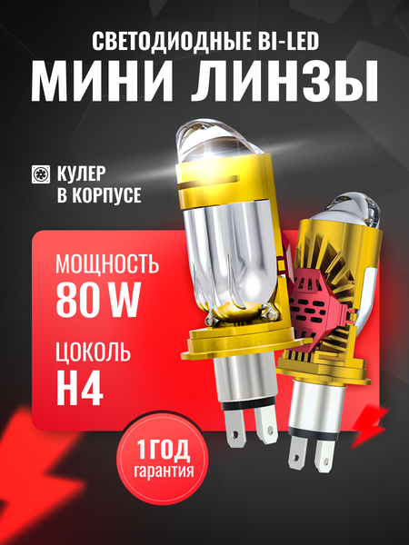 Обратите внимание! У некоторых моделей авто внутри фары установлен колпачок для отсечки пучка света. Его необходимо демонтировать. Рекомендуем перед покупкой обратить внимание на размеры ламп, указанные на одном из слайдов. Особенностью Bi-LED мини линзы h4 М01J является наличие 2-х чипов нового поколения. Один чип светит ближним светом через линзу в лампе. Второй чип светит дальним светом через вторую линзу в лампе. У большинства подобных ламп хороший ближний свет, но не особо хороший дальний. В этой лед лампе h4 с линзой дальний свет прекрасен! Данные светодиодные лампы h4 ярче галогена на 400% и подходят практически на все автомобили с цоколем H4. Линзы h4 имеют четкую свето-теневую границу (СТГ), исключающую ослепление встречного потока. Ближний и дальний свет формируются отдельными полусферическими отражателями и линзами лампы, минуя отражатель фары, и формируя равномерный яркий световой пучок. Использование в конструкции авиационного алюминия, а также охлаждающий вентилятор и встроенный термо-контроль, не дают лампе перегреваться во время работы. Заявленный срок службы данных ламп h4- более 50 000 часов. Если у вас остались вопросы задайте их в разделе «Вопросы о товаре» или напишите нам по синей кнопке «Написать в магазин/Чат»