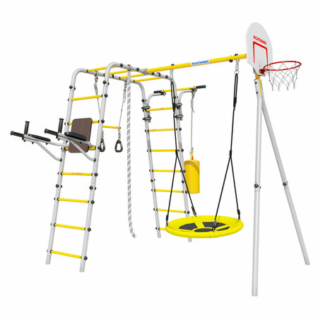 баскетбольный щит, груша боксерская, брусья, канат, кольца с перекладиной, гимнастическая лестница, рукоход, турник подвижный, качели гнездо