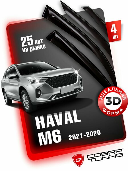 Ветровики на окна разработаны специально для Haval M6 (Хавал, Хавейл, Хавэйл М6) 2021, 2022, 2023, 2024, 2025 год, повторяют все изгибы автомобиля, идеально подойдут, не требуют подгонки. ► Что даёт установка дефлекторов на окна? При любых погодных условиях защищают салон авто от воды, снега и грязи Улучшают аэродинамические характеристики автомобиля, изменяя движение потока воздуха, не давая ему попасть в салон, тем самым устраняя эффект парусности и уменьшая расход топлива Дефлекторы окон - это декоративный элемент, который может украсить и подчеркнуть индивидуальность автомобиля ► Материал изготовления и способ крепления Наши ветровики на окна автомобиля производятся из лёгкого и высококачественного оргстекла, устойчивое к УФ излучению и со светопроницаемостью 21%. Крепятся с помощью качественной клейкой ленты 3М, произведённой в Германии. Установка не требует сверления и занимает в среднем 5-10 минут. Уважаемые клиенты! Обращаем ваше внимание, что дефлекторы имеют форму соответствующую модели данного автомобиля. Фото в карточке товара типовое, служит для визуального восприятия товара.
