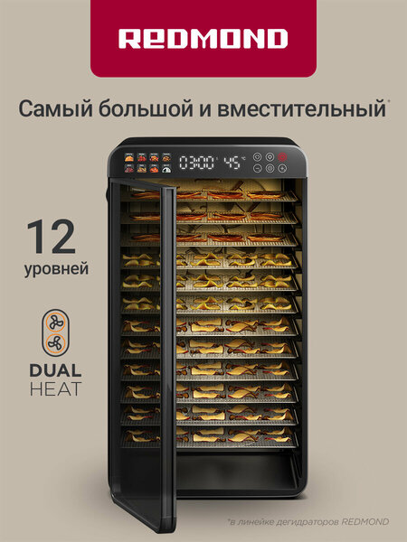 Сушилка для овощей, фруктов и мяса редмонд FD1104 — дегидратор, который станет незаменимым помощником для дачников и любителей правильного питания. Позволит засушить грибы и зелень на зиму, а также приготовить полезные и натуральные снеки. Система двойного обдува и регулировка температуры сделают устройство универсальным для разных типов продуктов — от укропа до свинины. Цельные поддоны позволят приготовить идеальную пастилу, а поддоны-сетки — засушить травы. Кроме дачных заготовок при помощи дегидратора можно сделать йогурт. В этом помогут специальные банки, которые идут в комплекте.