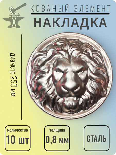 Штампованные элементы (Штамповка) из металла, это готовое решение для самостоятельного изготовления или декорирования ворот, заборов, калиток, мангалов и многого другого. С помощью элементов художественной ковки и штамповки каждый мастер сможет без труда создать садовый декор, домашний уют, самостоятельно собрать композиции для дизайна участка, лавочки, беседки, настенной полки, подставки для цветов, оградки, кованые стулья, любые кованые изделия и настоящие произведения искусства художественной ковки для декорирования вашего садового участка или придомовой территории. Кованые завитки, представленные в нашем магазине, пики, листья, корзинки, фонарики, накладки, заглушки, новершия и другие в сочетании друг с другом можно использовать для создания различных композиций из металла которые в свою очередь так же представлены в широком ассортименте нашего магазина. Все элементы изготовлены методом холодная штамповка из стали Каждый элемент имеет уникальный размер и дизайн На элементах могут присутствовать следы естественной коррозии (ржавчины) , что в незначительных объемах, так же не является существенным дефектом (браком). Срок службы каждого элемента при условии соблюдения правил эксплуатации (грунтование, покраска) неограничен - Голова Льва 260 мм выполнена из стали - Поставляется комплектами по 1,3,5 или 10 шт
