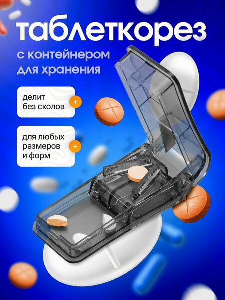Таблетница с делителем таблеток - удобный и практичный аксессуар для хранения, переноса и разделения таблеток. Этот контейнер обеспечивает надежное хранение лекарственных препаратов и их удобное дозирование. Таблетница и таблеткоделитель встроены в один аксессуар, что делает использование этой таблетницы еще более удобным. Таблеткорез с контейнером - функциональный помощник в делении таблеток без лишних усилий и риска для здоровья. Благодаря надежным механизмам и острым лезвиям таблеткорезка легко и безопасно разделит таблетку на равные части с необходимой точностью. Вторая секция таблетницы с делителем отделена небольшой перегородкой и используется для безопасного и длительного хранения лекарств. Через прозрачный корпус хорошо видно, сколько таблеток осталось внутри. Таблетница на день выполнена из пищевого прозрачного пластика с черным оттенком, лезвие резака выполнено из нержавеющей стали, что обеспечивает долгий срок службы и надежность в работе. Таблетница с делителем для таблеток имеет надежную систему защелкивания. Благодаря эргономичному дизайну такой разделитель таблеток с контейнером маленький комфортен и удобен в использовании. Больше не нужно беспокоиться о том, что драже разобьется или высыпется. Делитель таблеток – это отличный ассистент в уходе за здоровьем. Не упустите возможность приобрести таблетницу на день с делителем и сделать жизнь проще. Ваше здоровье - самое ценное достояние, позаботьтесь о нем!