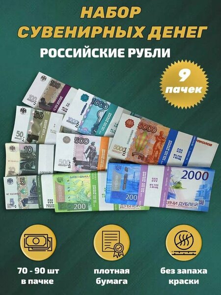 {"widgets":{"@card/UniversalPromoBadge":{"/content/page/fancyPage/universalPromoBadge":{"wrapperProps":{"margins":{"bottom":"3"}},"initialTime":1759752491348,"offerComposeId":"779038435"}}},"meta":{"/content/page/fancyPage/universalPromoBadge":{"name":"@card/UniversalPromoBadge"}},"collections":{"productServiceSnippets":{"779038435":{"productSnippet":{"type":"MODEL_CARD_LAYOUT","productPayload":{"title":{"value":"Деньги фальшивые, фейковые, игрушечные, набор из 9 пачек сувенирных купюр российских рублей для игры, свадеб, выкупов"},"badges":{},"wishlistButton":{"mskuId":103143746619,"businessId":15537514,"modelId":779038435,"oskuId":103143754855},"rating":{"reviewsCount":2,"ratingCountStats":{"cnt3":1,"cnt4":0,"cnt2":0,"cnt1":1,"cnt5":11},"ratingValue":4.5,"ratingCount":13},"gallery":{"galleryType":"VISUAL","mediaItems":[{"type":"IMAGE","picture":{"height":935,"width":701,"title":"Деньги фальшивые, фейковые, игрушечные, набор из 9 пачек сувенирных купюр российских рублей для игры, свадеб, выкупов","baseUrl":"https://avatars.mds.yandex.net/get-mpic/4884224/2a00000190591d471fe9ae0f447f33c78115/"}},{"type":"IMAGE","picture":{"height":935,"width":701,"title":"Деньги фальшивые, фейковые, игрушечные, набор из 9 пачек сувенирных купюр российских рублей для игры, свадеб, выкупов","baseUrl":"https://avatars.mds.yandex.net/get-mpic/12456181/2a00000190591d4198ee6d746121baff3999/"}},{"type":"IMAGE","picture":{"height":935,"width":701,"title":"Деньги фальшивые, фейковые, игрушечные, набор из 9 пачек сувенирных купюр российских рублей для игры, свадеб, выкупов","baseUrl":"https://avatars.mds.yandex.net/get-mpic/4954989/2a00000190591d425a28625864933fbe9d21/"}},{"type":"IMAGE","picture":{"height":935,"width":701,"title":"Деньги фальшивые, фейковые, игрушечные, набор из 9 пачек сувенирных купюр российских рублей для игры, свадеб, выкупов","baseUrl":"https://avatars.mds.yandex.net/get-mpic/12235261/2a00000190591d484d07053c98c374c9fcd2/"}},{"type":"IMAGE","picture":{"height":935,"width":701,"title":"Деньги фальшивые, фейковые, игрушечные, набор из 9 пачек сувенирных купюр российских рублей для игры, свадеб, выкупов","baseUrl":"https://avatars.mds.yandex.net/get-mpic/12579532/2a00000190591d42caa7c7985aa72fdb1b3e/"}},{"type":"IMAGE","picture":{"height":935,"width":701,"title":"Деньги фальшивые, фейковые, игрушечные, набор из 9 пачек сувенирных купюр российских рублей для игры, свадеб, выкупов","baseUrl":"https://avatars.mds.yandex.net/get-mpic/12168282/2a00000190591d46c1eb544d3a4f602df612/"}},{"type":"IMAGE","picture":{"height":935,"width":701,"title":"Деньги фальшивые, фейковые, игрушечные, набор из 9 пачек сувенирных купюр российских рублей для игры, свадеб, выкупов","baseUrl":"https://avatars.mds.yandex.net/get-mpic/12222123/2a00000190591d42cc57b8eda0af7bc436f5/"}},{"type":"IMAGE","picture":{"height":935,"width":701,"title":"Деньги фальшивые, фейковые, игрушечные, набор из 9 пачек сувенирных купюр российских рублей для игры, свадеб, выкупов","baseUrl":"https://avatars.mds.yandex.net/get-mpic/3922047/2a00000190591d413b79fa3822f527489a46/"}},{"type":"VIDEO","video":{"title":"Деньги фальшивые, фейковые, игрушечные, набор из 9 пачек сувенирных купюр российских рублей для игры, свадеб, выкупов","streams":[{"url":"https://strm.yandex.ru/vod/vh-market-upload-converted/vod-content/vplvksgtsunrpdysq7y2/72828a61-78f9-4cdf-abe4-9f38f04b4cce/kaltura/desc_0aa1f21bc598820122980eafb85fbb38/x/ysign1=dca2525e76718f68a0a11387d2e97fa84d20c571d69577950f412249d058943d,abcID=56084,chID=vplcw5a4be2almmy7knw,pfx,sfx,ts=68e6542b/manifest.mpd?packager=1","type":"dash"},{"url":"https://strm.yandex.ru/vod/vh-market-upload-converted/vod-content/vplvksgtsunrpdysq7y2/72828a61-78f9-4cdf-abe4-9f38f04b4cce/kaltura/desc_0aa1f21bc598820122980eafb85fbb38/x/ysign1=1504f9aa036fb1193a7089490cce8f7d57246a40c8afad3cbe6170b642d7278c,abcID=56084,chID=vplcw5a4be2almmy7knw,pfx,sfx,ts=68e6542b/master.m3u8?packager=1","type":"hls"}],"height":1024,"url":"https://runtime.strm.yandex.ru/player/video/vplvksgtsunrpdysq7y2","preview":{"height":1024,"width":768,"title":"Деньги фальшивые, фейковые, игрушечные, набор из 9 пачек сувенирных купюр российских рублей для игры, свадеб, выкупов","baseUrl":"https://avatars.mds.yandex.net/get-mpic/13581167/2a0000019998cce3321e02437c948181165f/"},"width":768}}]},"snippetStyle":"NORMAL"},"baobabPayload":{"marketSku":"103143746619","type":"offer","isUltima":false,"modelId":779038435,"snippet_type":"product","wareId":"out-of-stock","oskuId":103143754855,"hid":62943172,"isExpress":false,"vendorId":13757013}}}}}}