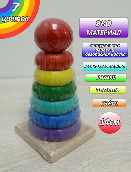 Пирамидка для малышей - Развивающая игрушка от 1 года - Пирамидка деревянная, высотой 14,5 см. Пирамидка для малышей - это классическая развивающая игрушка от 1 года. Связано это с тем, что Пирамидка для малышей несет в себе большое количество возможностей. Пирамидка для малышей развивают интеллект и логическое мышление, мелкую моторику, координацию движений, внимание, память, усидчивость. Пирамидка детская познакомит малыша с цветами и с понятиями «больше-меньше». Деревянная пирамидка экологична, сделана из дерева и окрашена специальными гипоаллергенными красками.
