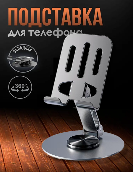 Металлическая подставка для телефона, настольная, складная. Вращение на 360 градусов. Держатель позволяет зафиксировать смартфон в нужном положении. Имеет возможность регулировки высоты и углов наклона. Надежное удержание вашего телефона на столе. Складная подставка для мобильного изготовлена полностью из металла. Настольный держатель подходит для использования со всеми типами смартфонов и небольшими планшетами. Железная подставка легко складывается, что делает её удобной для хранения и переноски. Компактный размер делает этот держатель аксессуаром для повседневного использования. Вращение держателя на 360 градусов и регулируемые углы наклона позволяют удобно расположить айфон на столе в любом положении, что обеспечивает оптимальный комфорт при просмотре видео или общении в социальных сетях. Раскладная алюминиевая подставка для сотового обеспечивает комфортное размещение гаджета в вертикальном или горизонтальном положении. Универсальное решение для организации рабочего пространства. Силиконовые накладки обеспечивают надёжное сцепление с поверхностью и предотвращают скольжение телефона, а также защищают его от царапин и других повреждений. Вращение сопровождается акустическим эффектом храпового механизма. Выдерживает вес до 1кг. До 5000 вращений вокруг своей оси. До 9000 складываний.