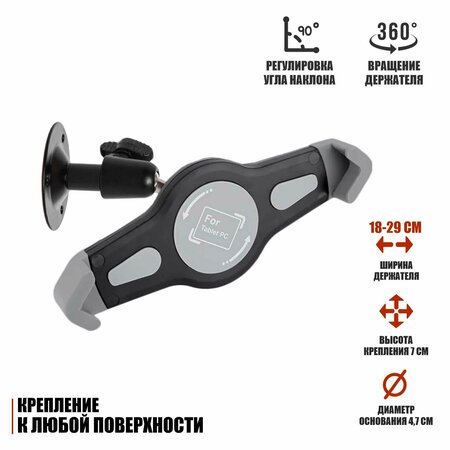 Держатель для планшета крепится на стену или стол при помощи винтов. Данный комплект позволяет закрепить планшет на стене или рабочей стойке и регулировать угол наклона и поворота устройства. Настенный кронштейн для планшета - это универсальное устройство, которое отлично подойдёт для расположения подставки возле розетки, что позволит освободить рабочую поверхность и заряжать устройство в любой момент. Подходит для фиксации планшетов размером от 18 до 29 см в ванной, на кухне, в комнате или на рабочем столе в торговых точках, где необходима работа в планшете. Особенности: - Прочная фиксация оборудования. - Шарнирный механизм крепления позволяет вращать держатель планшета и регулировать угол наклона. - Универсальное применение. - Прорезиненные вставки держателя планшета предотвращают деформацию устройства. - Возможность закрепить оборудование в любом удобном месте надежно при помощи винтового крепления. - Для установки на вертикальную и горизонтальную поверхность. Характеристики: - Материал: пластик ABS, металл. - Для планшетов шириной от 18 до 29 см. - Высота крепления: 6 см. - Диаметр основания крепления: 4,7 см. - Резьба крепления: 1/4". - Диаметр шарнирной части: 1,4 см. - Набор вспомогательного крепежа в комплекте. Гарантийный срок: 1 месяц В комплекте: Держатель для планшета NKSH-C18 настенный - 1 шт